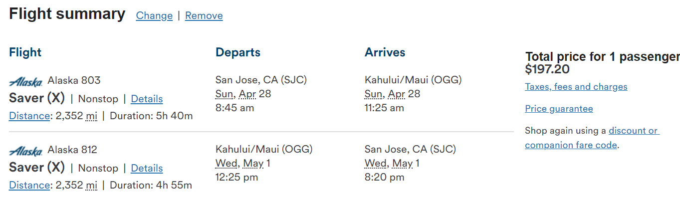 San Jose (SJC) to Kahului, Maui (OGG) for $197 round-trip nonstop on Alaska Saver Fares: