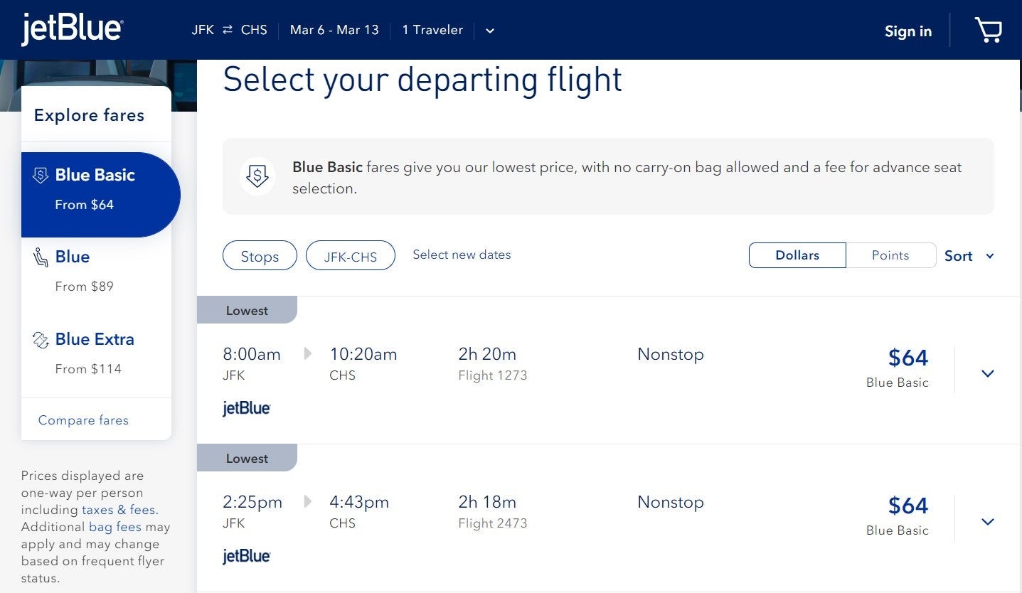 On JetBlue, we found Blue Basic seats available for $64 one-way from JFK to CHS for a nonstop flight.