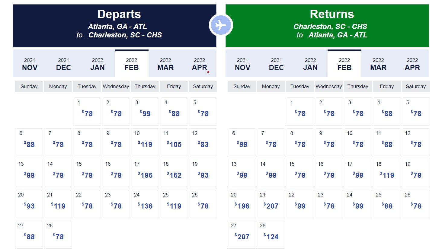 Southwest has ample availability throughout February and March from Atlanta (ATL) to CHS. The best fare we could find was $78 each way.