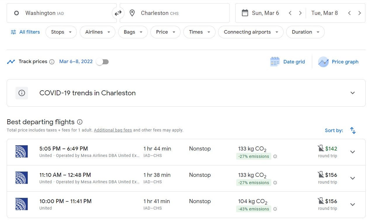 On Google Flights, United had a number of options for nonstop flights from Washington, D.C. (IAD) to CHS in March between $142-156 round-trip, including taxes and fees.