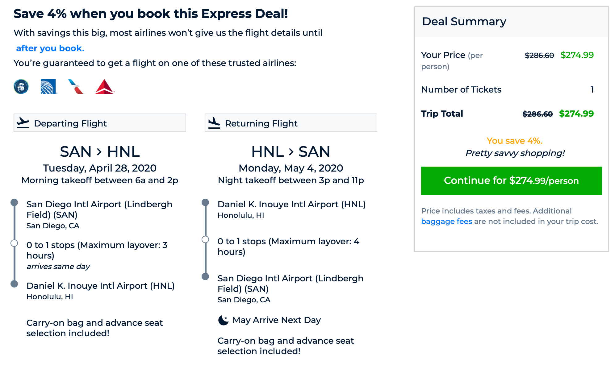 San Diego (SAN) to Honolulu (HNL) for $274 round-trip: