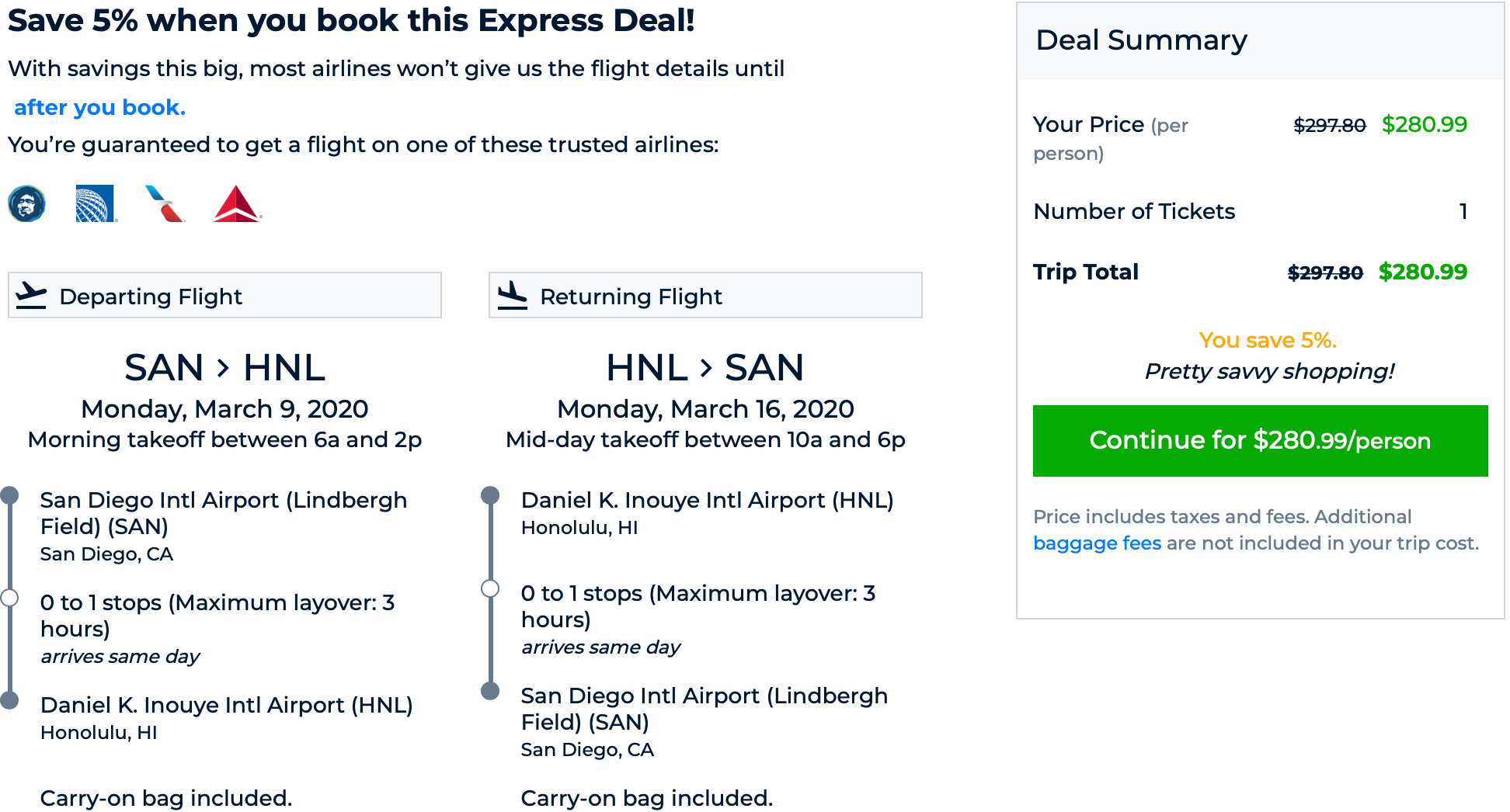 San Diego (SAN) to Honolulu (HNL) for $281 round-trip: