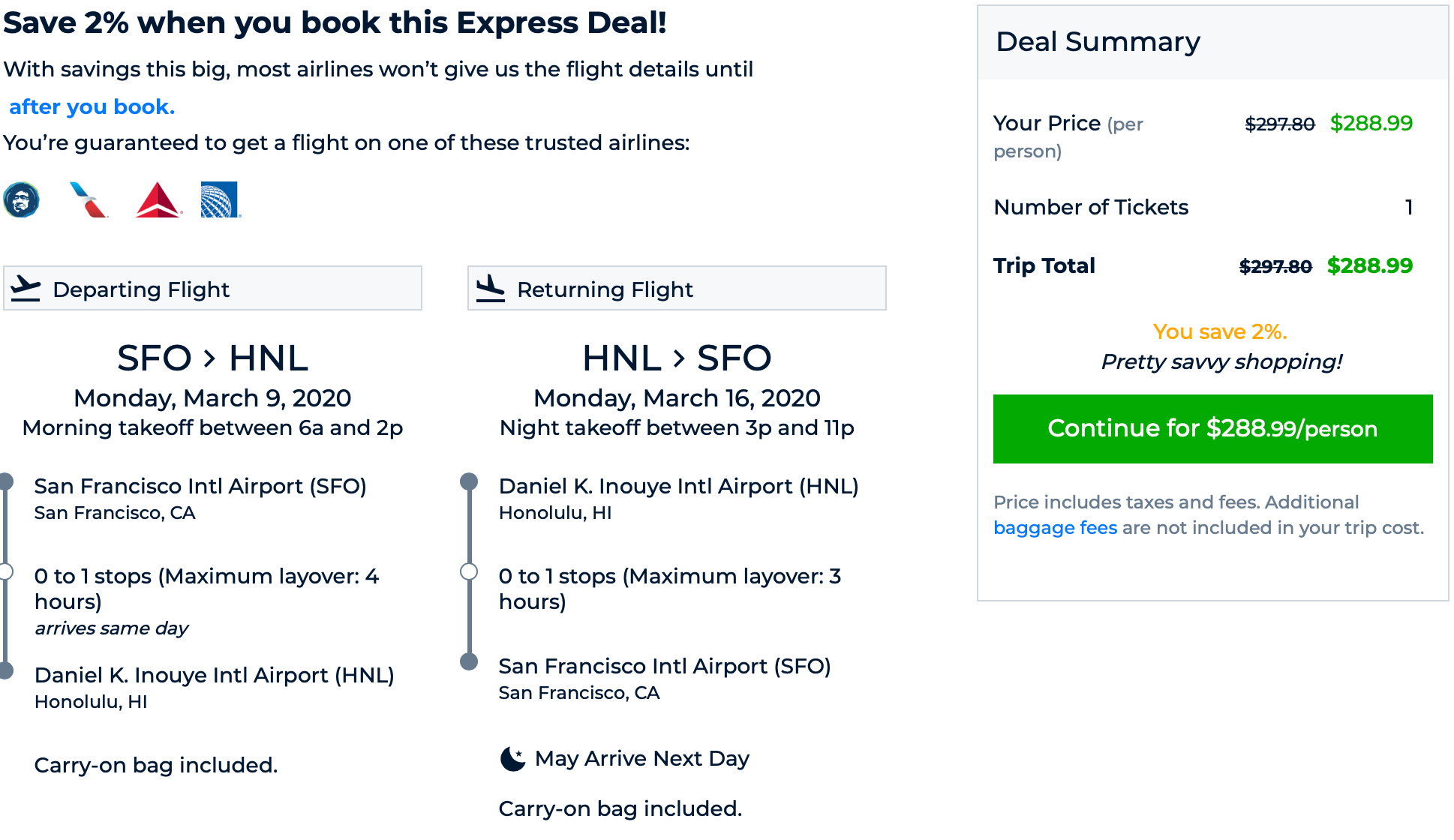 San Francisco (SFO) to Honolulu (HNL) for $288 round-trip: