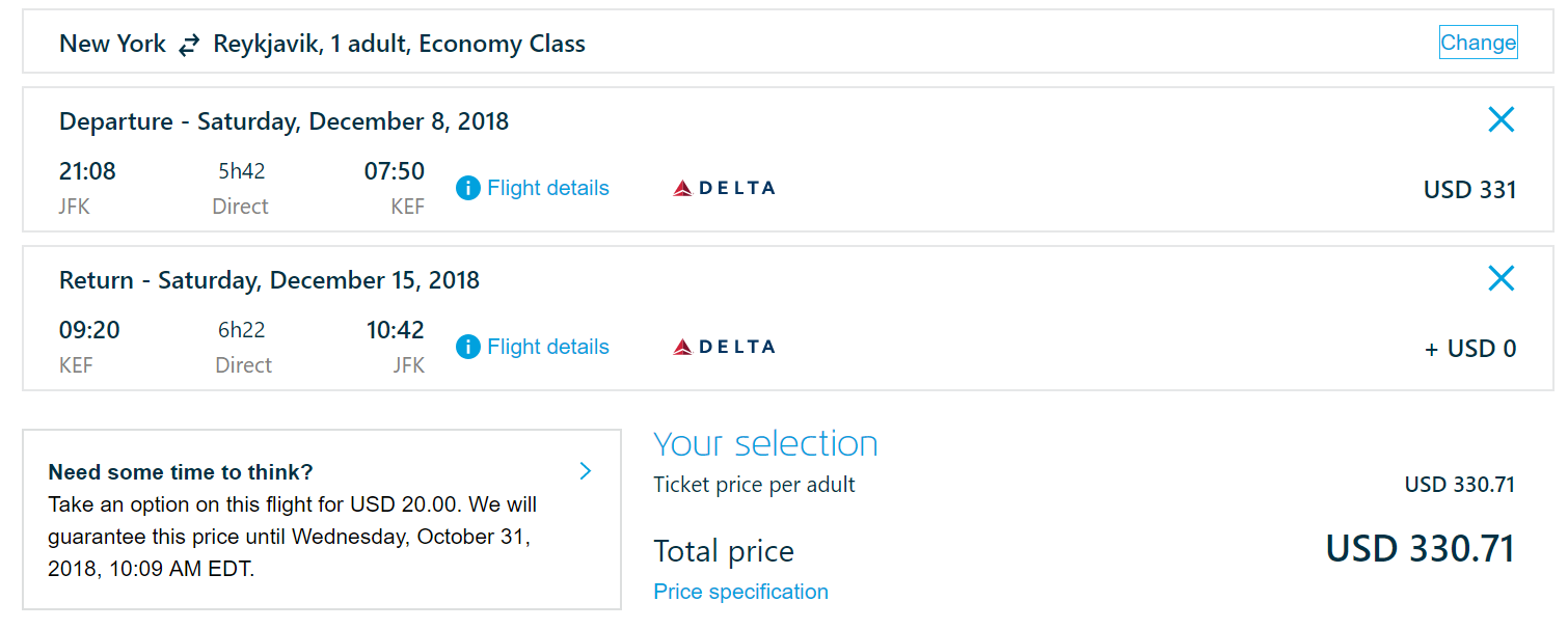 New York Kennedy (JFK) to Reykjavik (KEF) for $331 round-trip nonstop on Delta (via KLM):