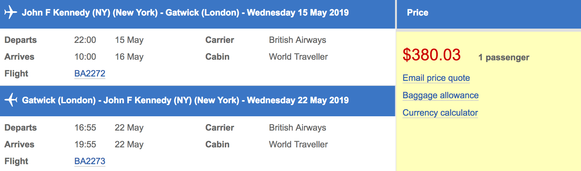 New York (JFK) to London (LGW) for $380 round-trip nonstop on British Airways: