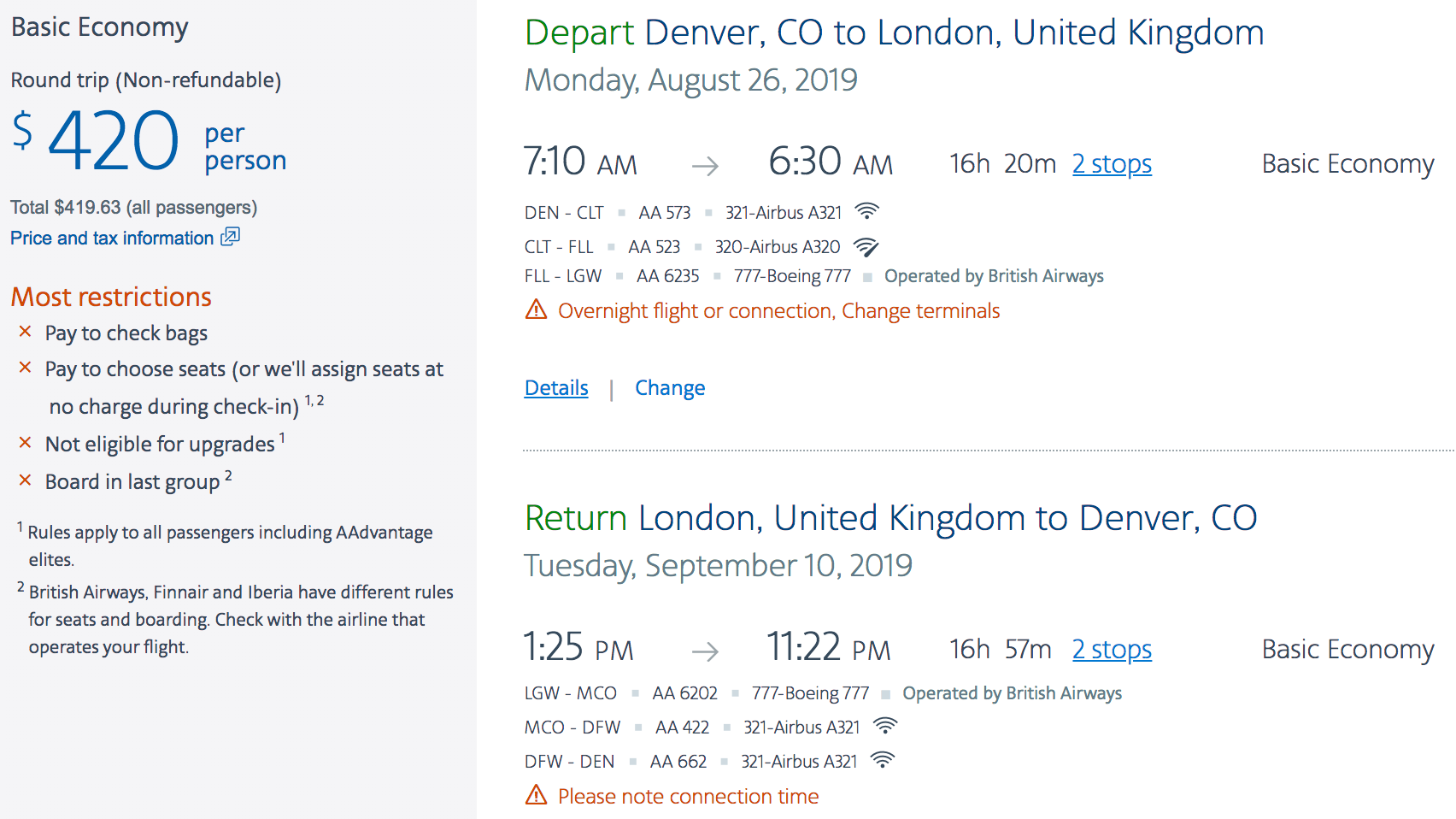 Denver (DEN) to London (LGW) for $420 round-trip on American: