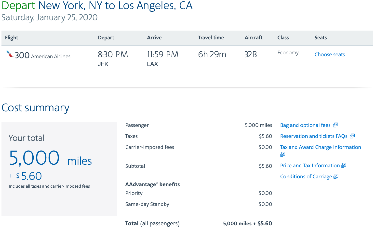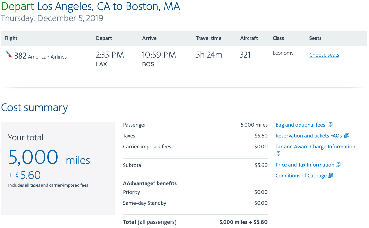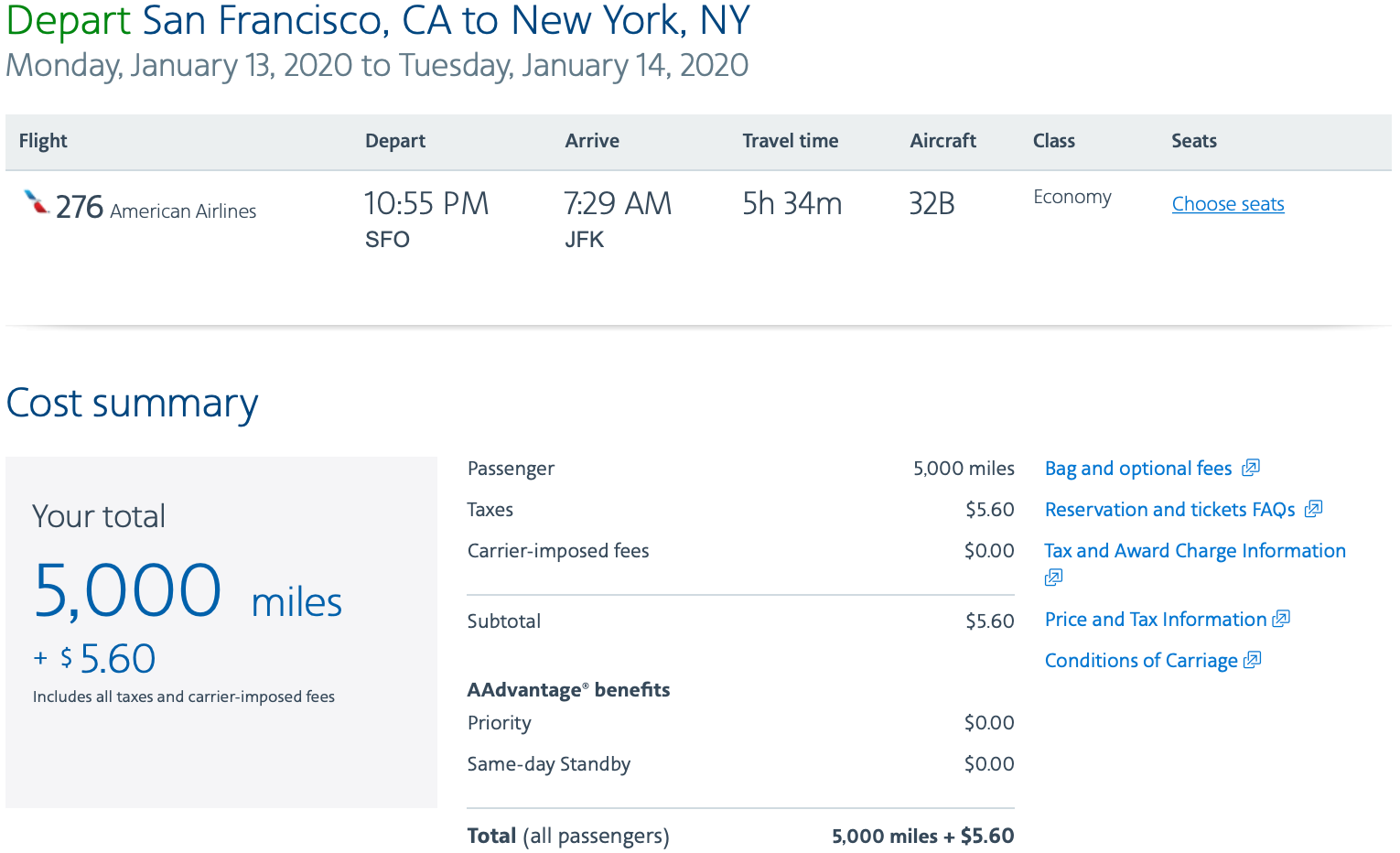 Cost: 5,000 miles + $5.60 taxes/fees one-way