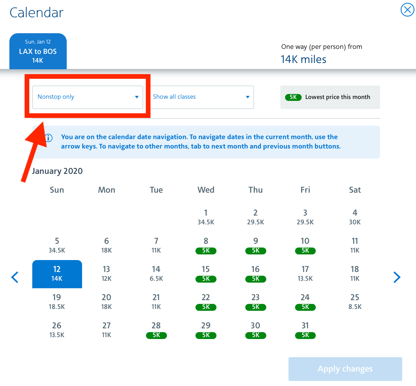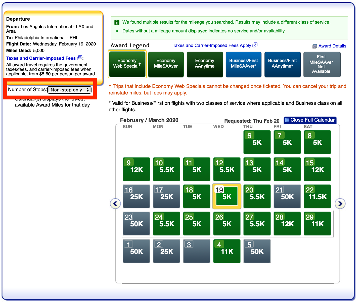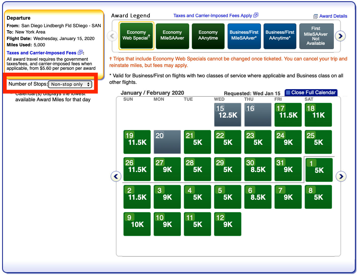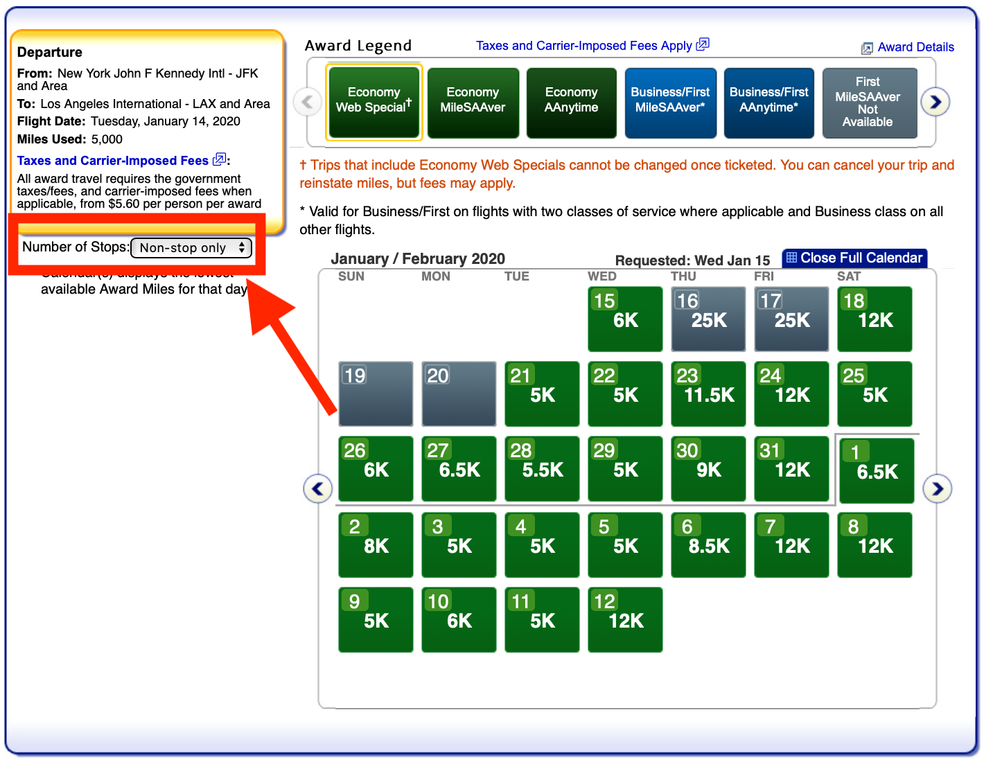 It doesn't matter if you're using the new award booking tool or the classic one, you can filter your search to only show nonstop awards by using the calendar view.