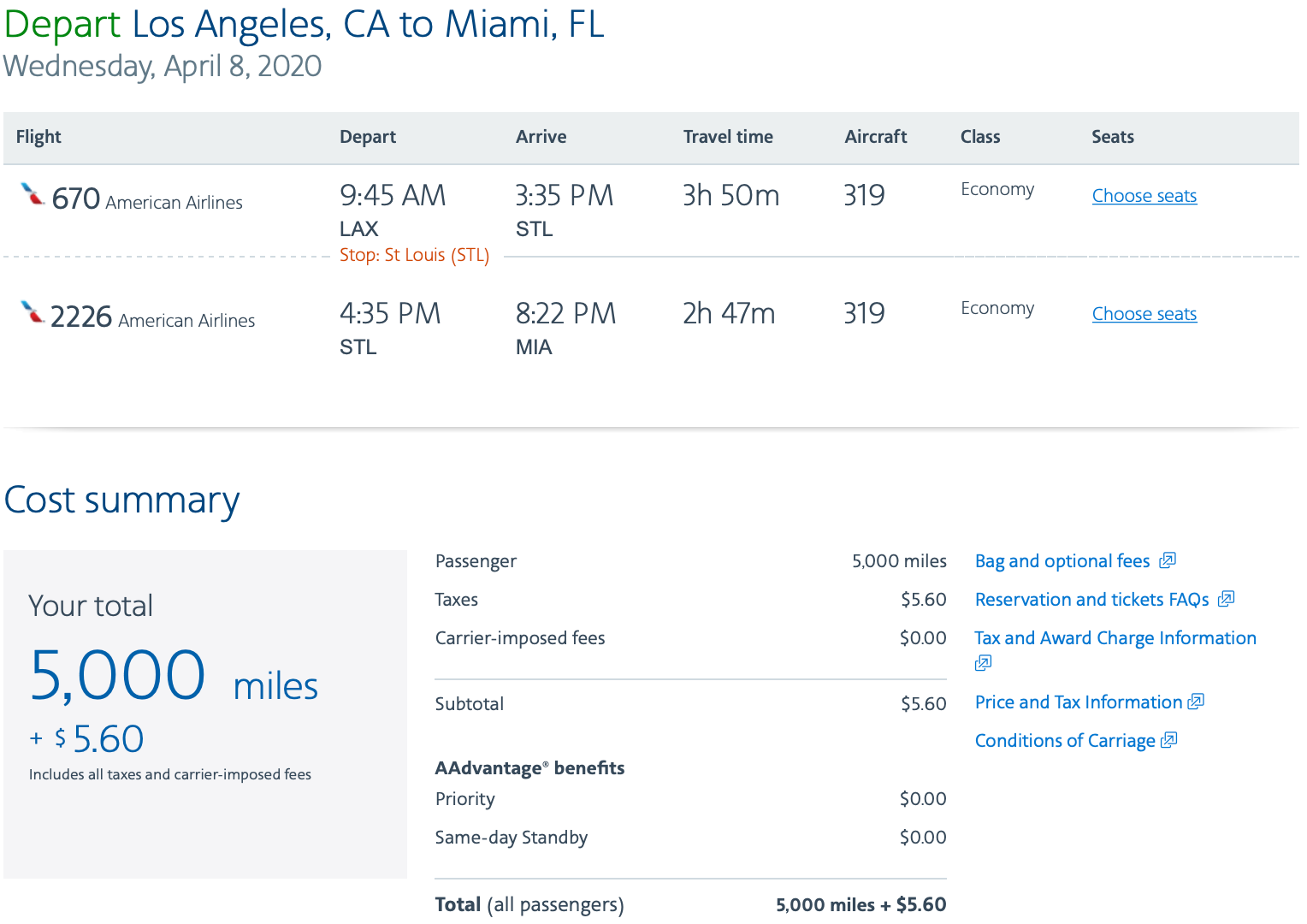 Los Angeles (LAX) to Miami (MIA) for 5,000 miles one-way in April 2020: