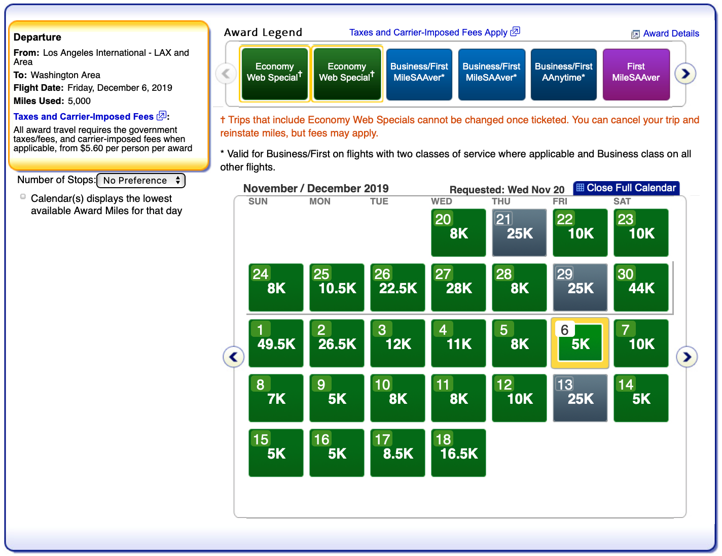 While American Airlines' recent expansion of dynamic award pricing has been a case of good news/bad news, the prices offered as of late on its Economy Web Specials continue to impress. A number of nonstop and one-stop routes between the East and West Coasts — such as Los Angeles (LAX) to New York-JFK and Los Angeles to Miami (MIA) — are currently available from just 5,000 American Airlines miles plus $5.60 in each direction. Even better, these low rates are widely available from November 2019 all the way through October 2020, including around the winter holidays, spring break and over the summer.