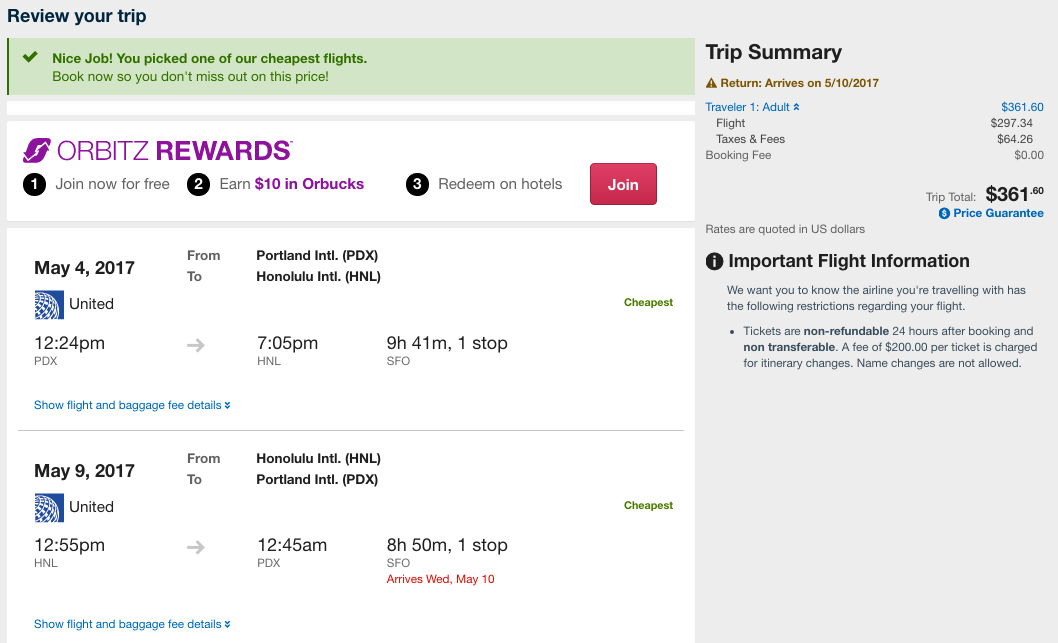 Portland (PDX) to Honolulu (HNL) for $362 round-trip in May via Orbitz: