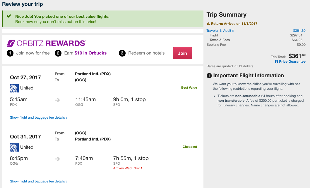 Portland (PDX) to Maui (OGG) for $362 round-trip in October via Orbitz: