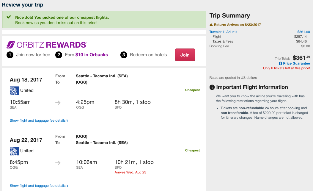 Airfare deals are typically only available on limited dates. We recommend you use Google Flights to find dates to fly, then book through an online travel agency, such as Orbitz or Expedia, which allows you to cancel flights without penalty by 11pm Eastern Time within one day of booking. However, if you’re using the American Express Platinum Card, you’ll need to book directly with the airline or through Amex Travel portal to get 5x MR points. Remember: Fares may disappear quickly, so book right away and take advantage of Orbitz or Expedia’s courtesy cancellation if you’re unable to get the time away from work or family.