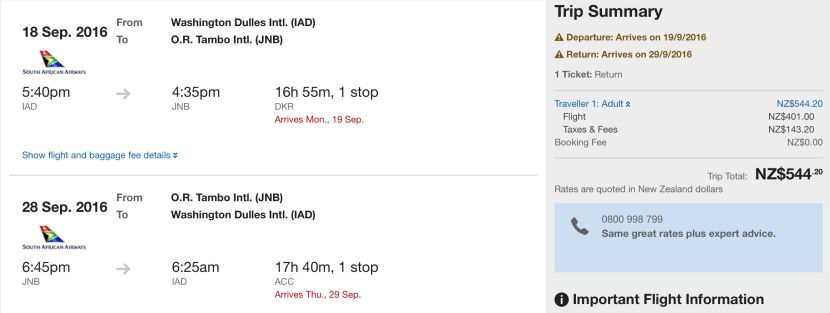 Washington, DC (IAD) to Johannesburg (JNB) from $390 (NZ $544) round-trip in September: