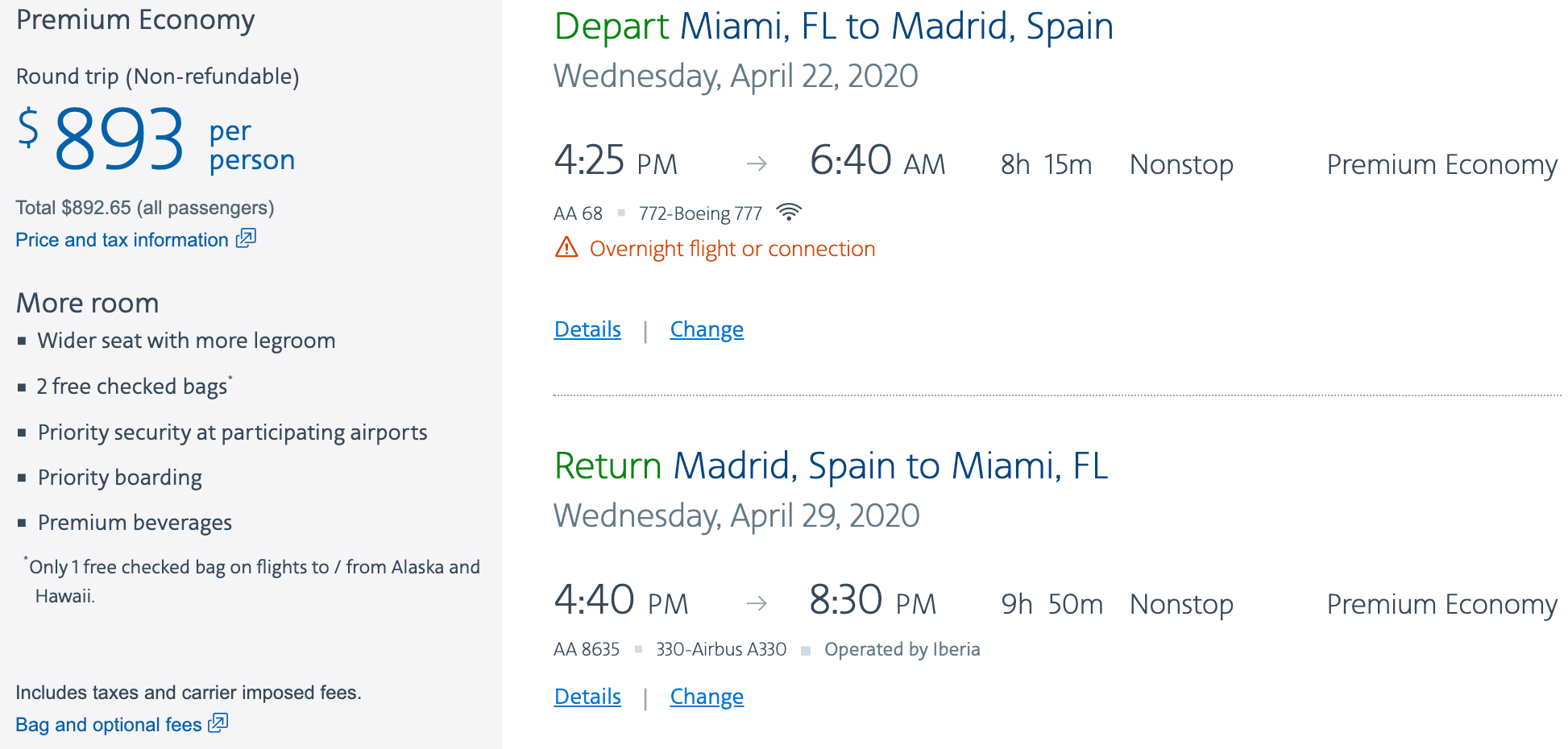 Miami (MIA) to Madrid (MAD) on American/Iberia for $893 round-trip: