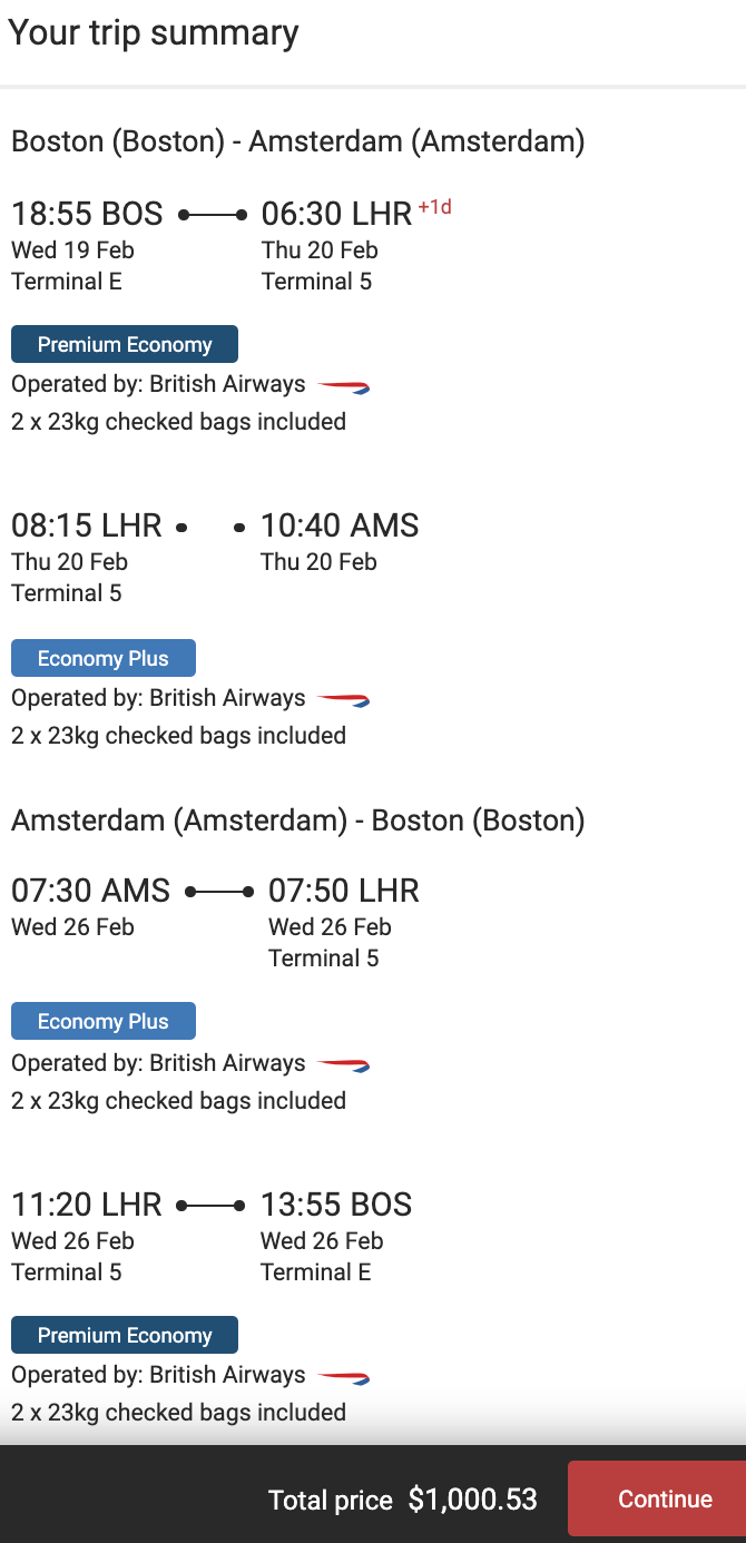 Boston (BOS) to Amsterdam (AMS) on British Airways for $1,001 round-trip: