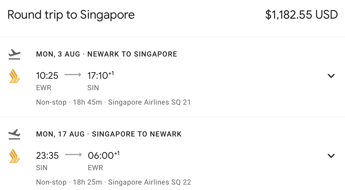 New York (EWR) to Singapore (SIN) for $1,183 round-trip via Google flights: