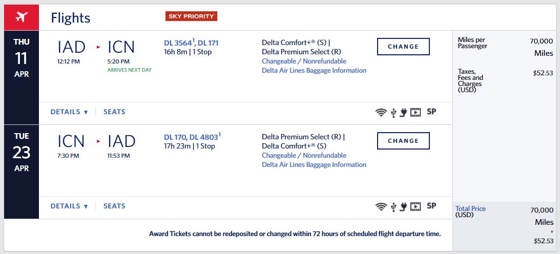 Tampa (TPA) to Seoul (ICN) for 70,000 SkyMiles + $53 round-trip: