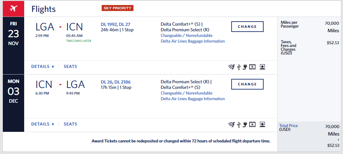 New York LaGuardia (LGA) to Seoul (ICN) for 70,000 SkyMiles + $53 round-trip: