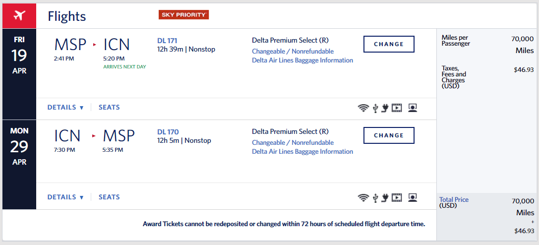 Minneapolis (MSP) to Seoul (ICN) for 70,000 SkyMiles + $47 round-trip nonstop: