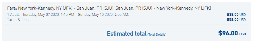 New York (JFK) to San Juan (SJU) for $96 round-trip nonstop on JetBlue: