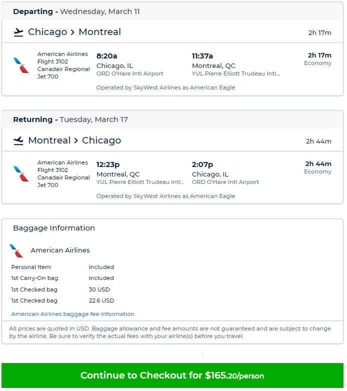Chicago (ORD) to Montreal (YUL) for $165 round-trip via American Airlines: