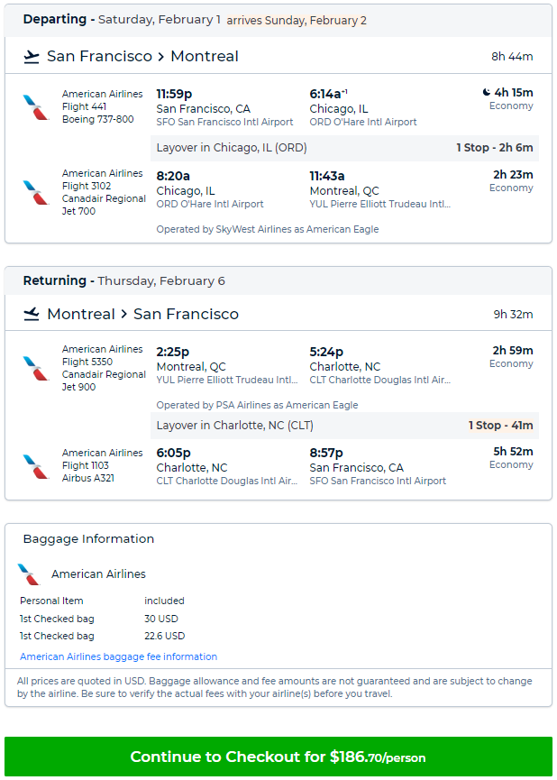 San Francisco (SFO) to Montreal (YUL) for $187 round-trip via American Airlines: