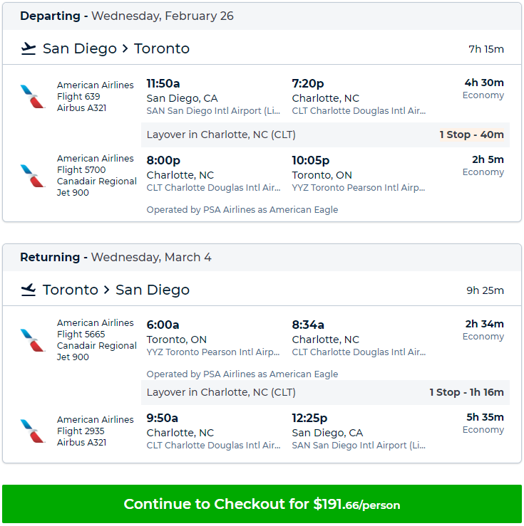 San Diego (SAN) to Toronto (YYZ) for $192 round-trip via American Airlines: