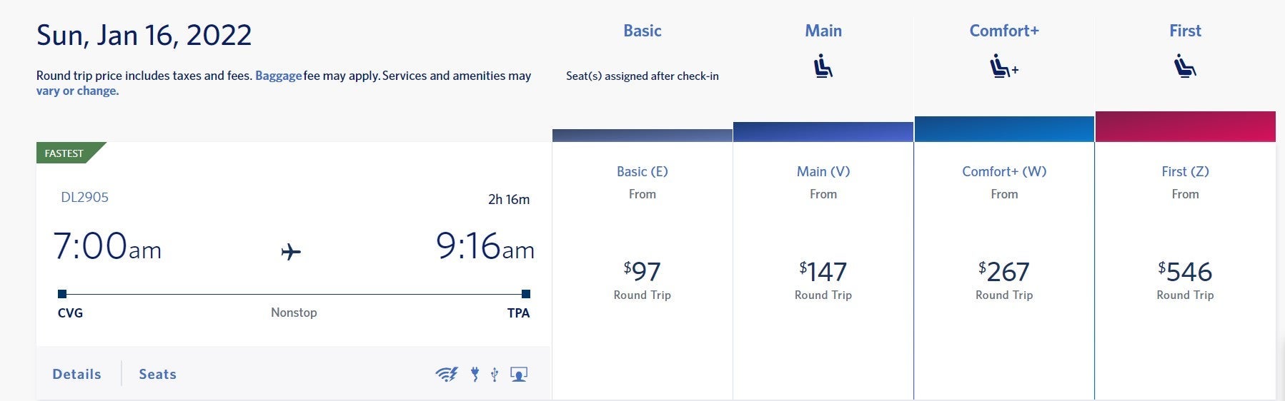 TPG found a round-trip deal on Delta for basic economy seats in mid-January from CVG-TPA nonstop at $97.