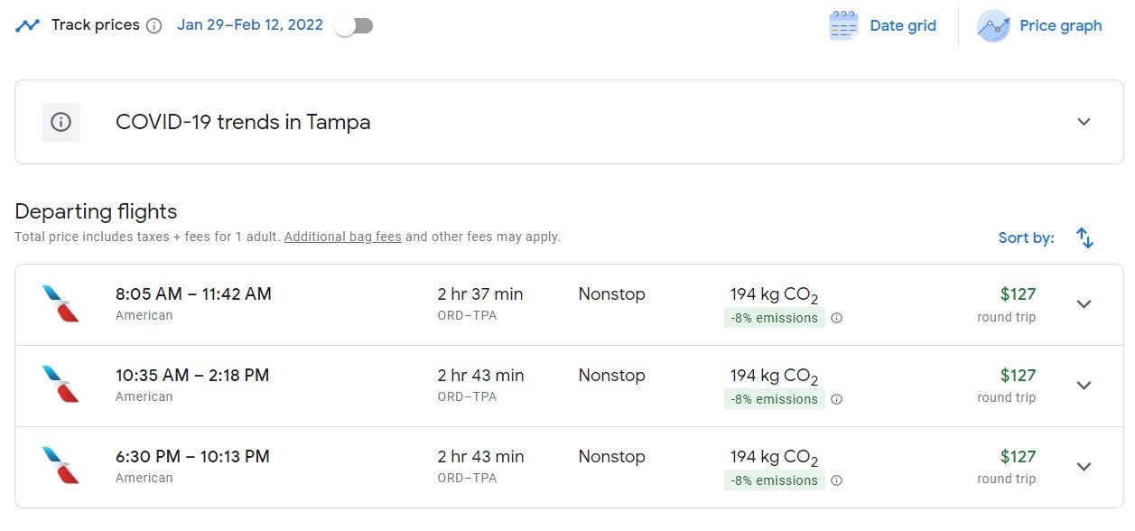 Google Flights shows several options available on American Airlines in late January and early February from ORD-TPA for $127.