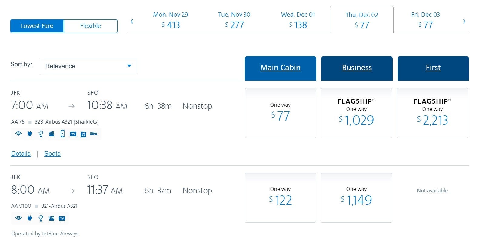 The deal below shows a nonstop trip booked on American Airlines from New York to San Francisco from $77-122 (or 10,000-12,500 points + $5.60) in the first week of December.