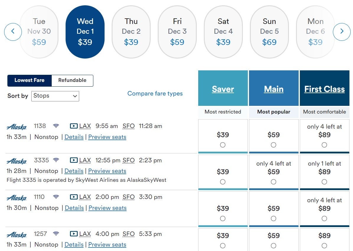 Even if you're already in California, you can still get away and explore other parts of the state. Fares from Los Angeles to San Francisco one-way range from $39 for economy seats, $59 for main cabin and $89 for first class in the first week of December.