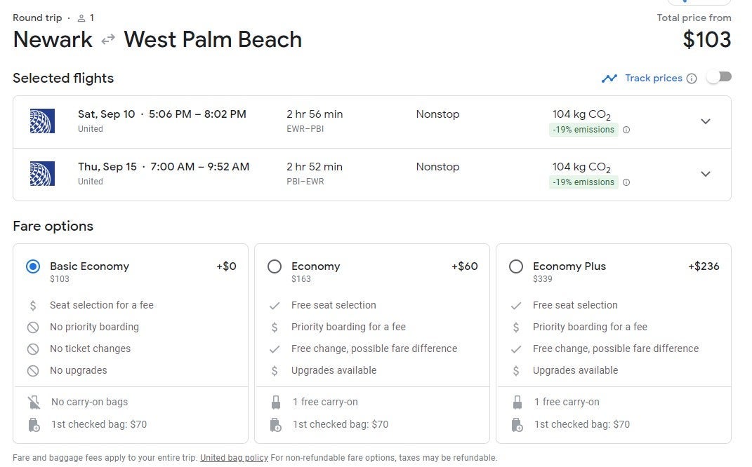 A sample United itinerary below, seen in Google Flights, shows the additional surcharges. If you're traveling with a carry-on bag, it makes more sense to pay the additional $60 each way for an economy seat rather than the bag surcharge with basic economy.