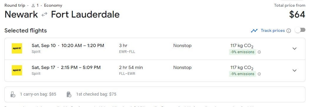 Be sure to note on the Google Flights screenshot above that Spirit is charging $85 each way if you want to bring a carry-on bag. This would more than triple the round-trip airfare, from $64 to $234, making this flight a poor deal. It's actually cheaper to check a bag round-trip ($150) than carry one aboard ($170).