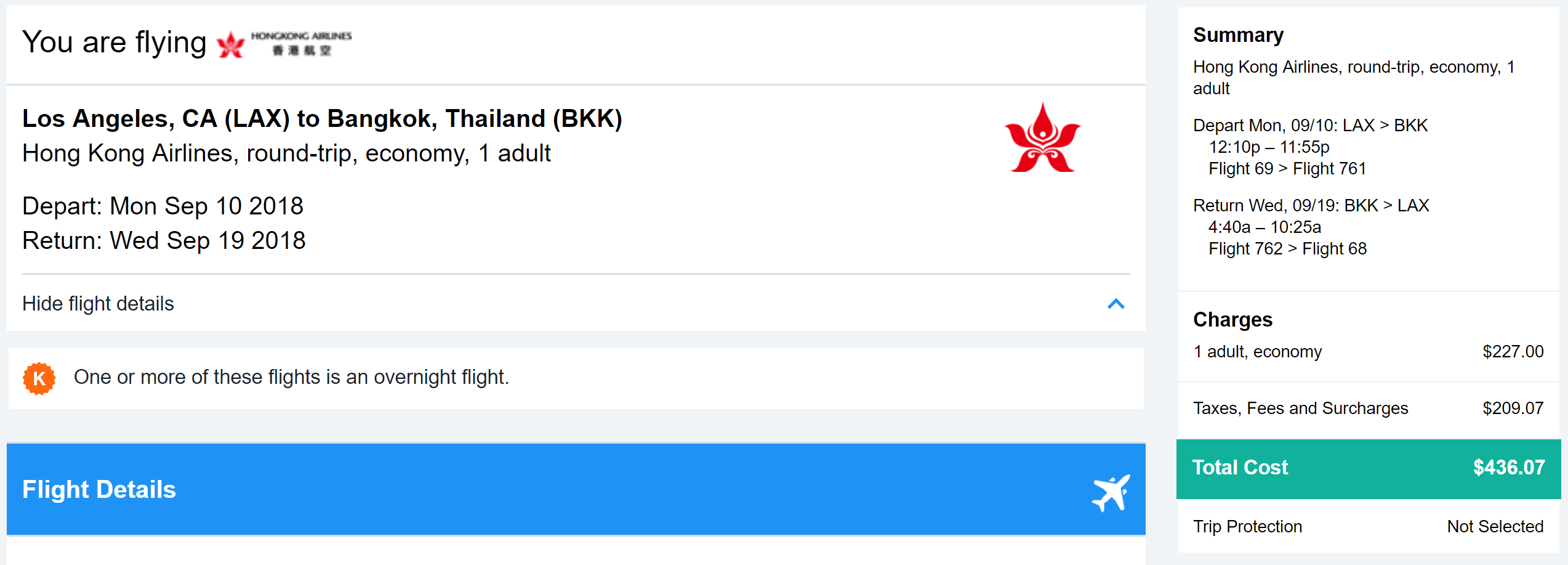 Los Angeles (LAX) to Bangkok (BKK) on Hong Kong Airlines for $436 round-trip via Kayak: