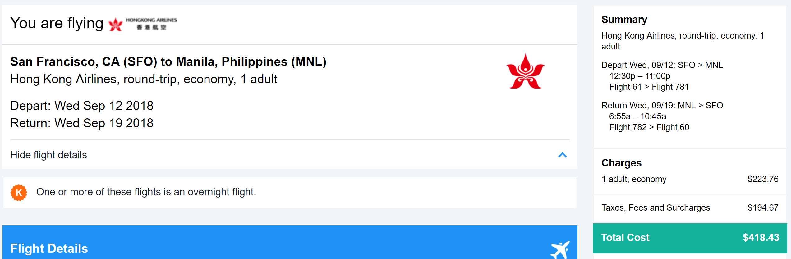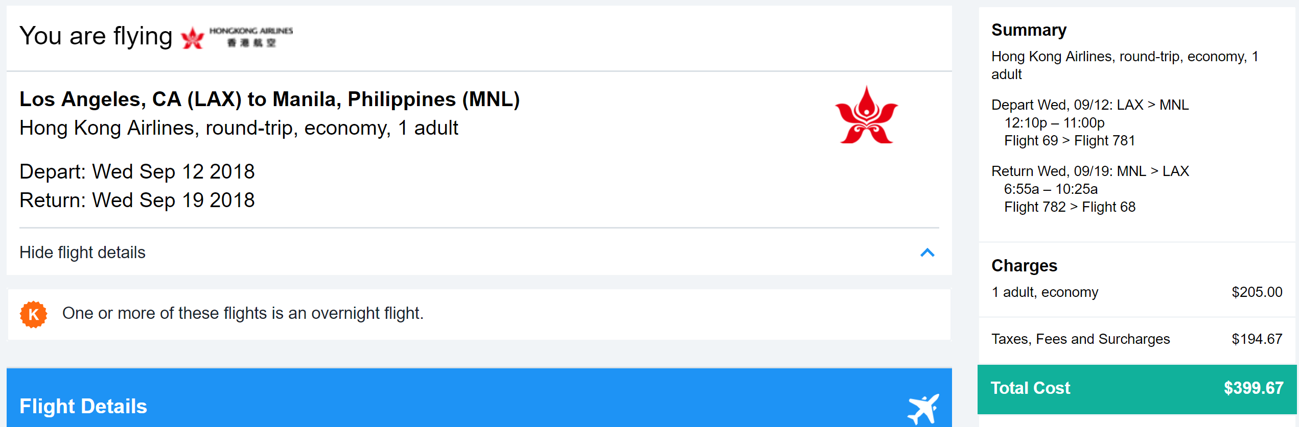 Booking Link: Kayak for Hong Kong Airlines flights. Orbitz, Expedia or directly with the airline for other airlines.