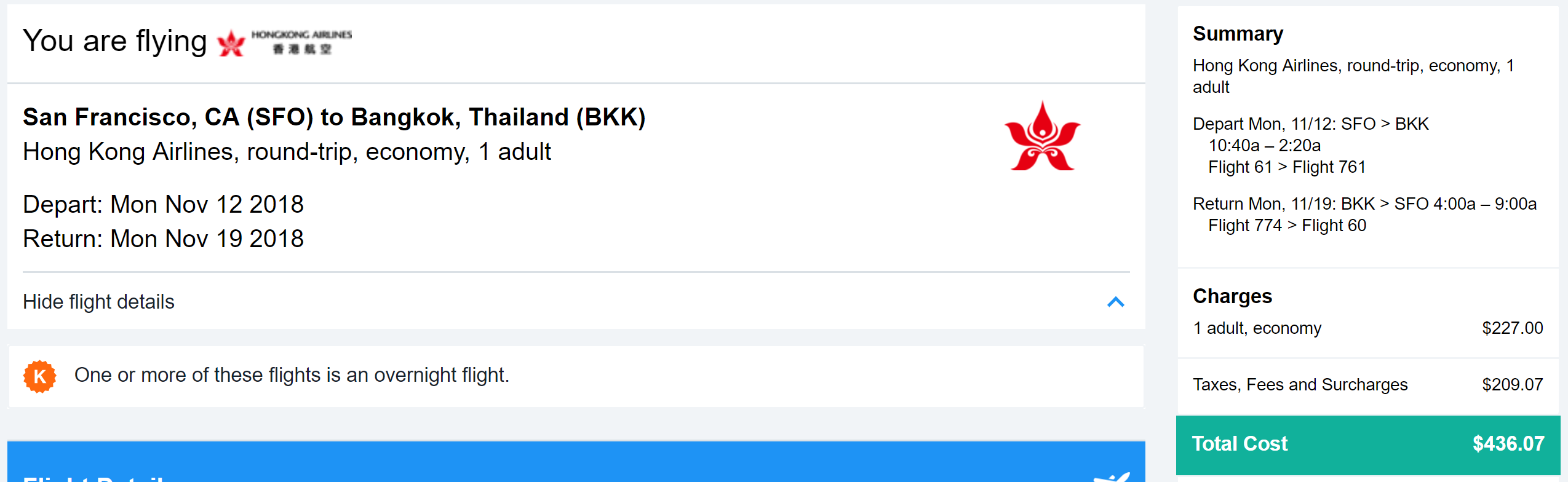 San Francisco (SFO) to Bangkok (BKK) on Hong Kong Airlines for $436 round-trip via Kayak: