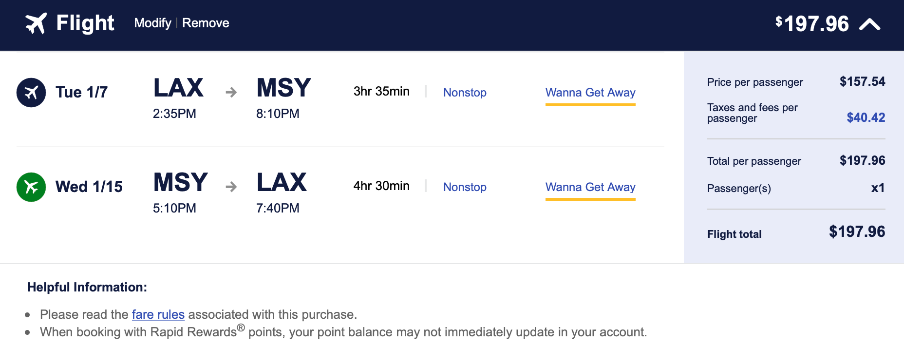 These fares are totally refundable, so make sure to check back to see if the price drops even further, because if you've already made a reservation through Southwest and later find that the price of the ticket has decreased, you can request the difference in fare with no change fees. Also remember that Southwest award redemptions are tied to the ticket's price, so this is a prime opportunity to use Southwest points for a cheap trip. You can transfer Chase Ultimate Rewards points to Southwest instantly at a 1:1 ratio.