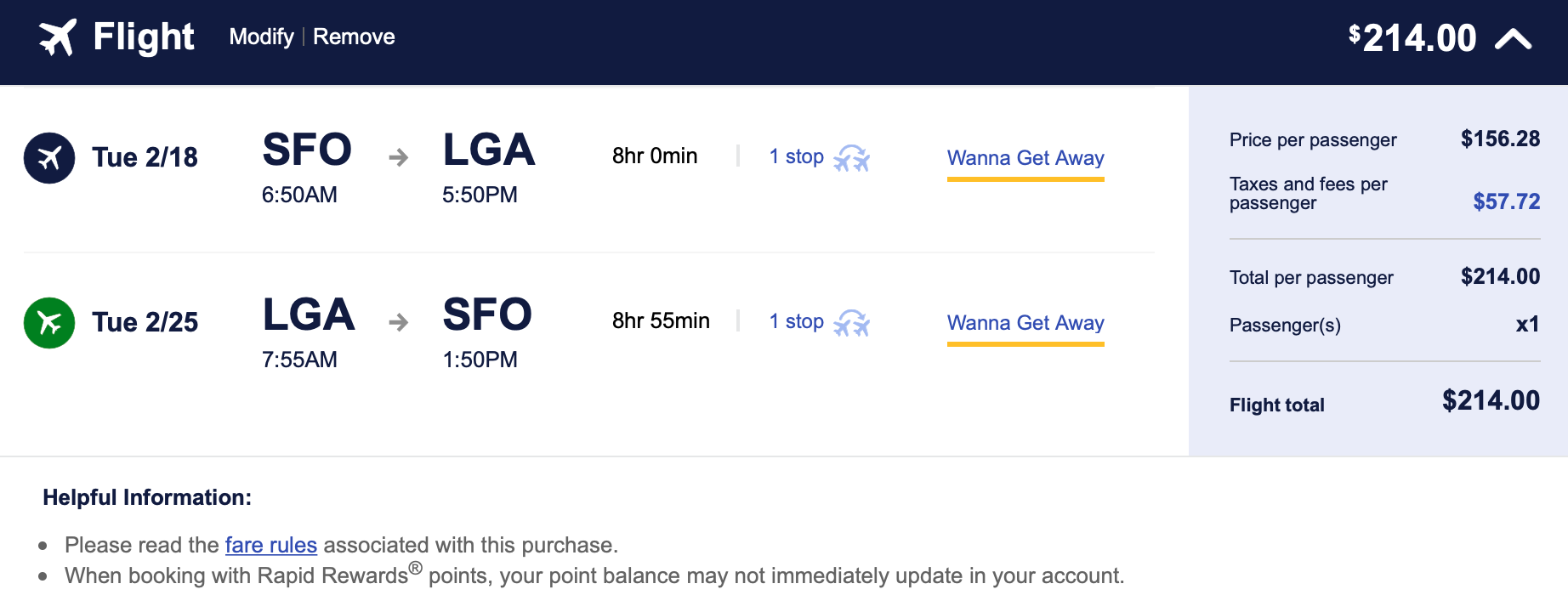 San Francisco (SFO) to New York (LGA) for $214 round-trip: