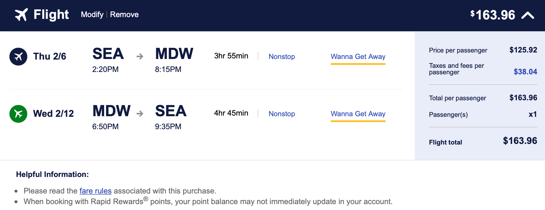Seattle (SEA) to Chicago (MDW) for $164 round-trip: