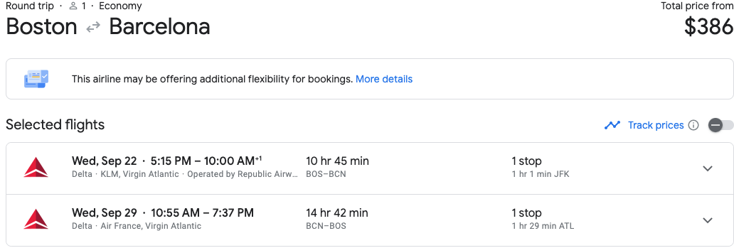 For example, you could fly from Boston to Barcelona in less than a month from now for $386 round-trip. Although most of the featured flights are not nonstop, several have short layovers, like the one below.