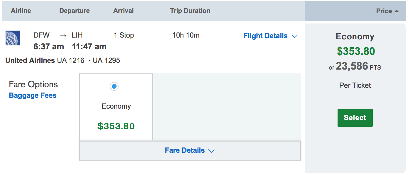 Dallas (DFW) to Lihue (LIH) for $354 round-trip or 23,586 UR points in August via Chase Ultimate Rewards portal: