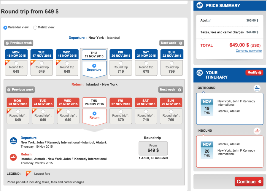 New York (JFK) to Istanbul (IST) for $649 on Turkish: