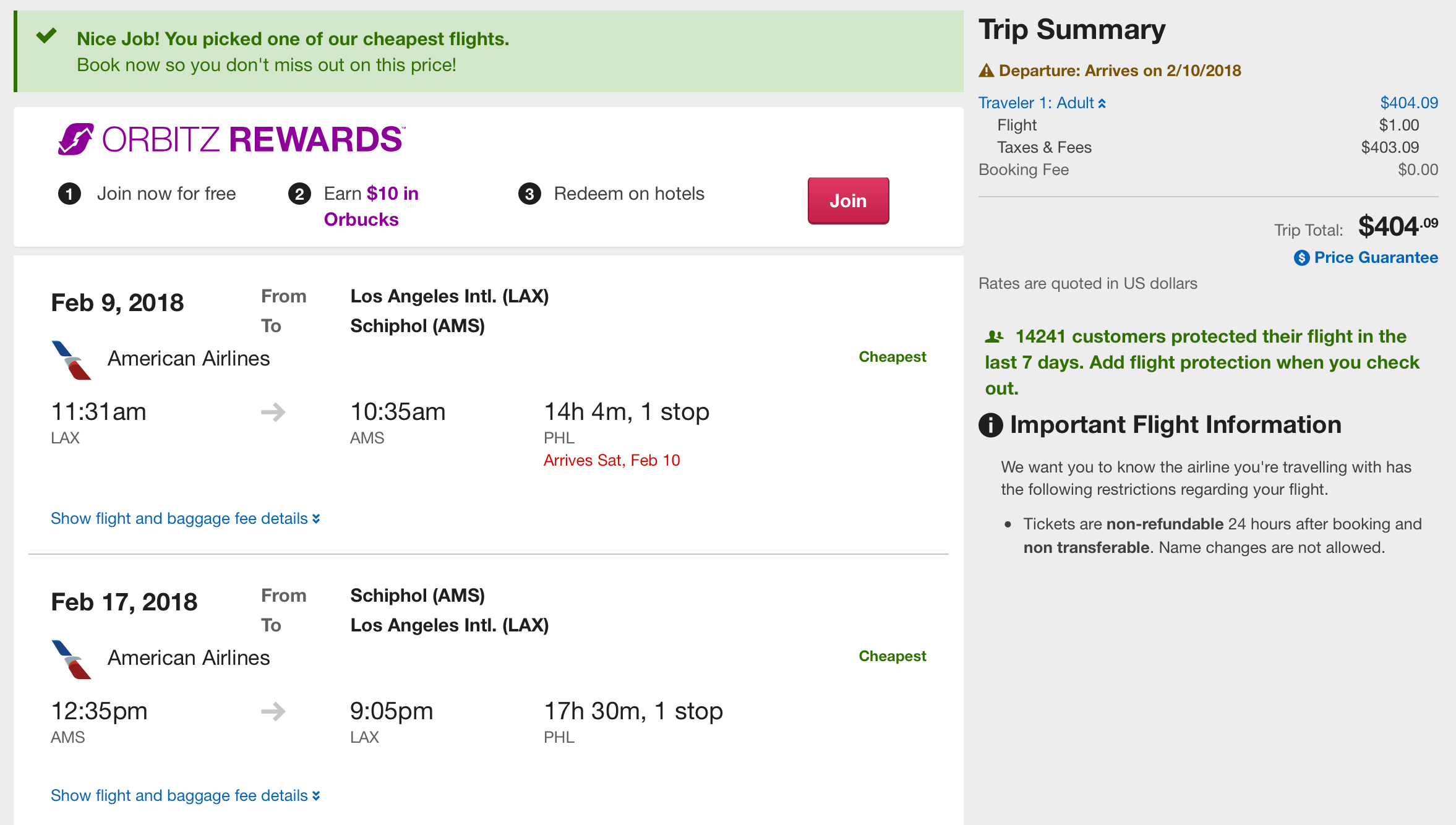 Los Angeles (LAX) to Amsterdam (AMS) for $404 round-trip on AA via Orbitz: