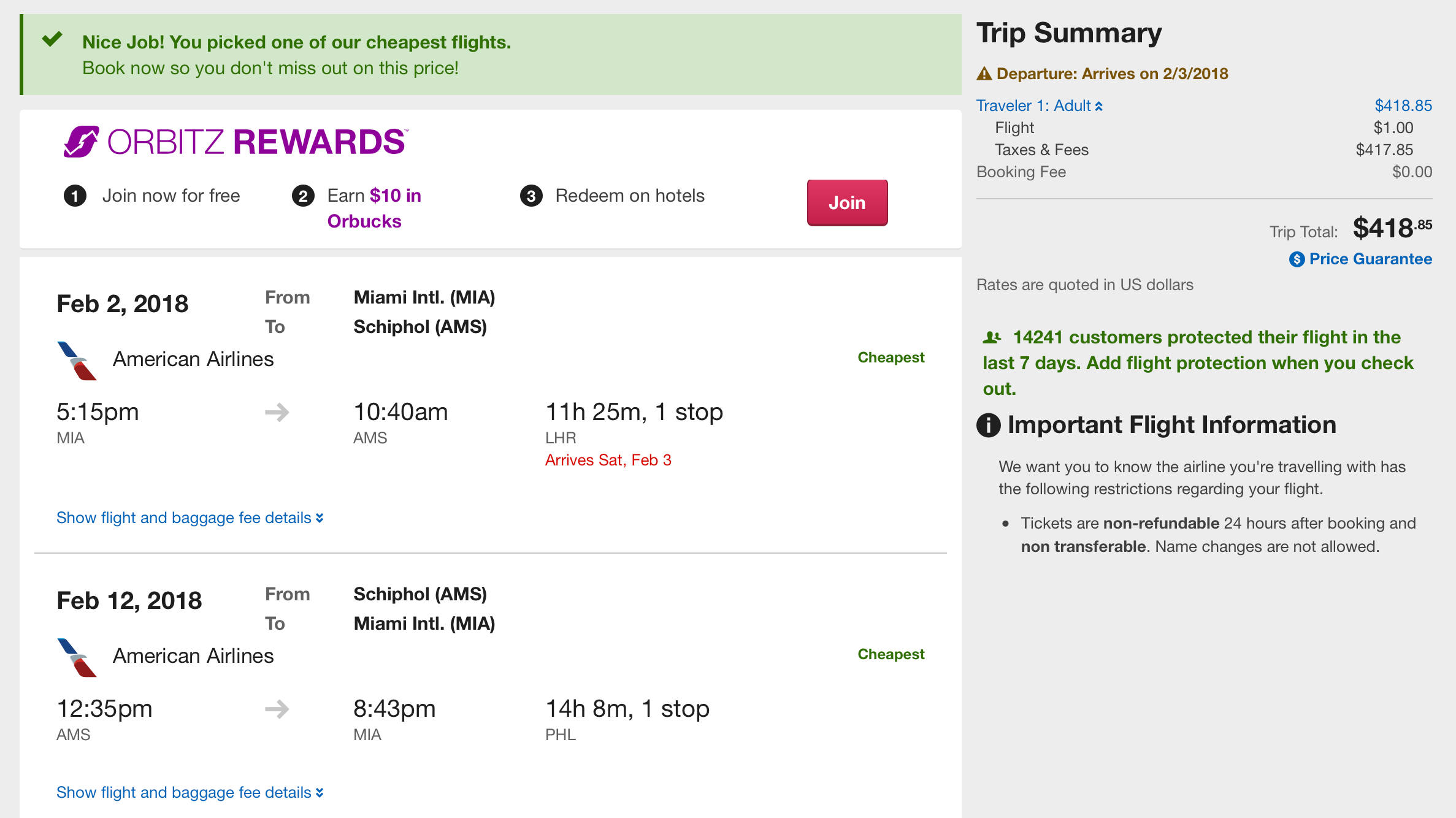 Miami (MIA) to Amsterdam (AMS) for $419 round-trip on AA via Orbitz: