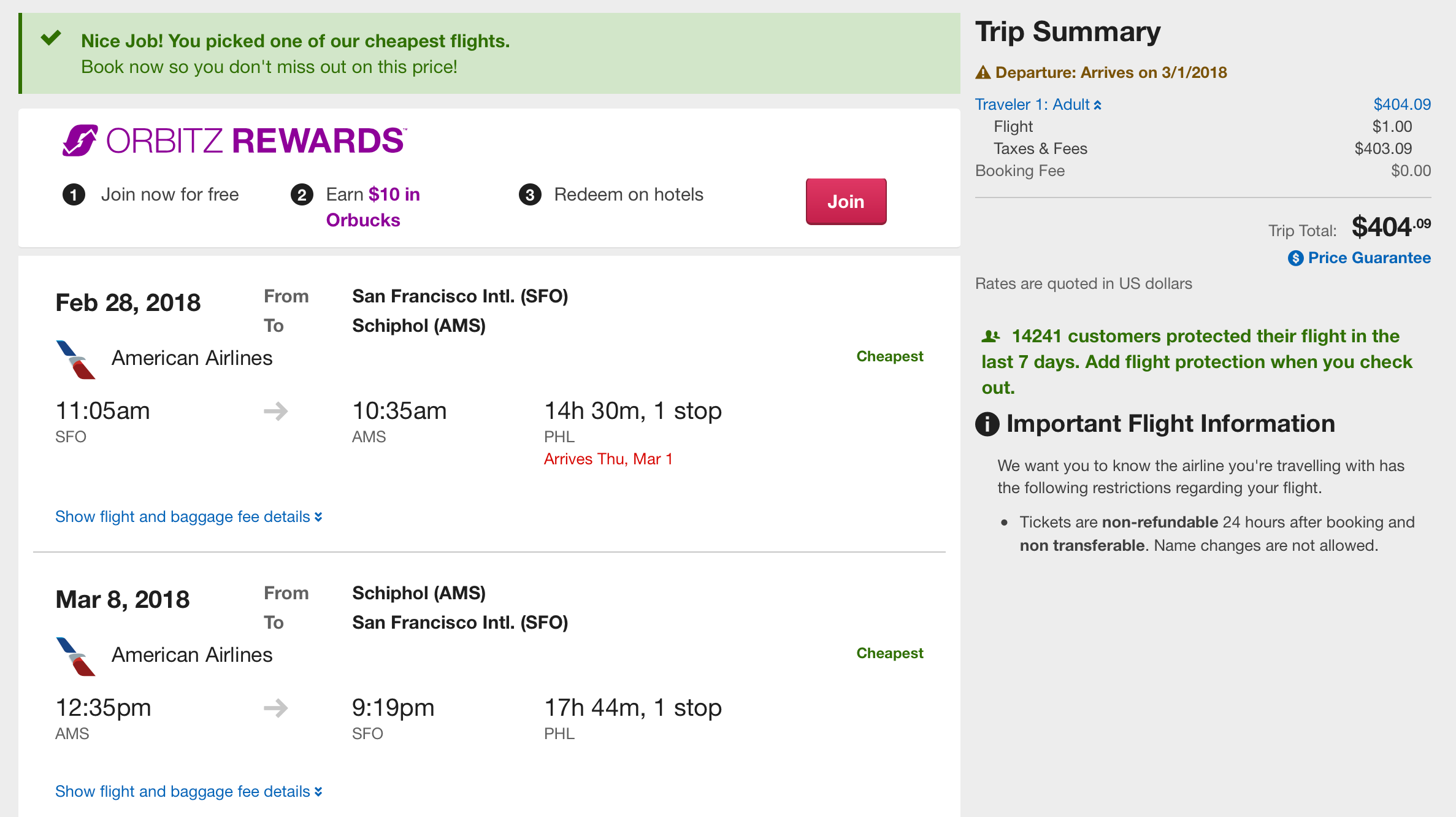 San Francisco (SFO) to Amsterdam (AMS) for $404 round-trip on AA via Orbitz:
