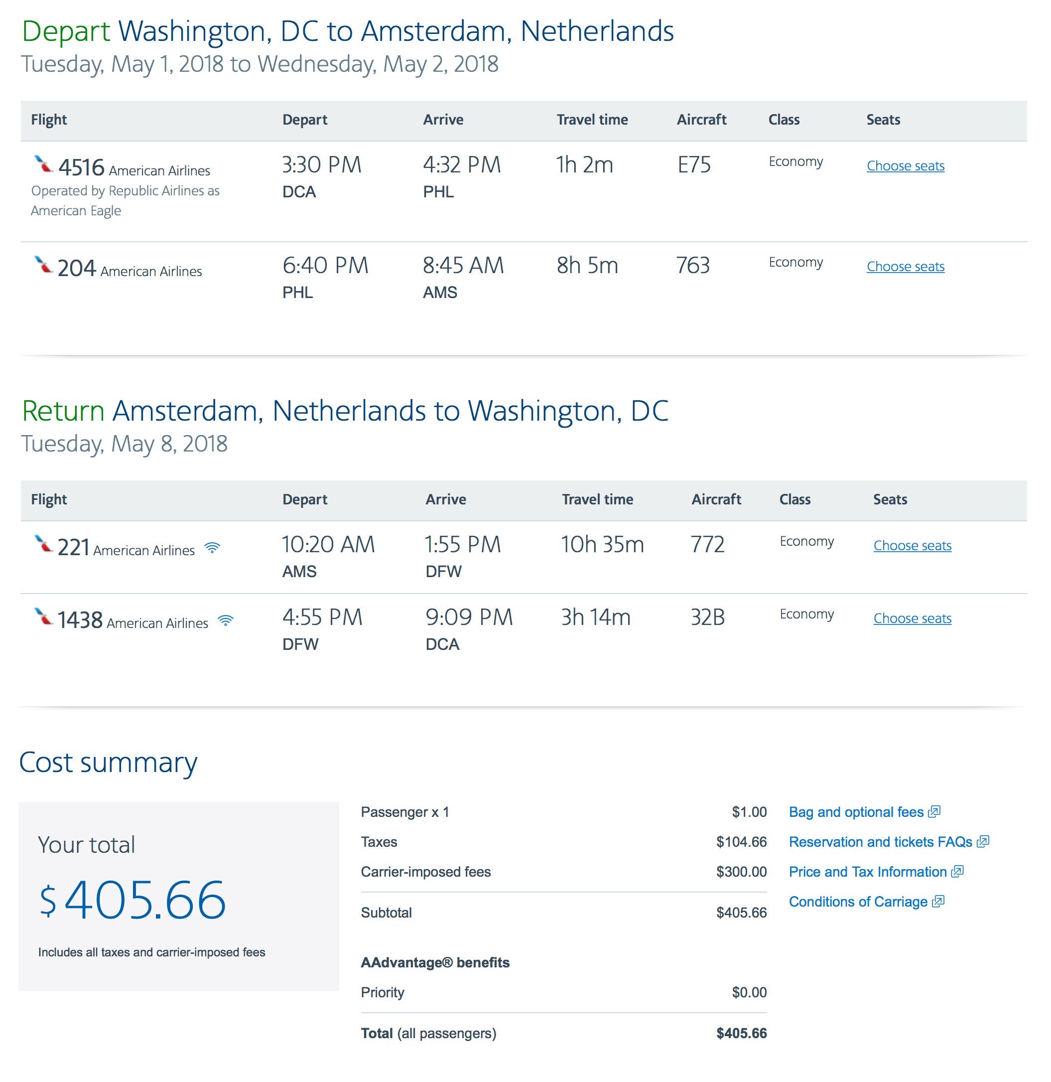 Washington, DC (DCA) to Amsterdam, Netherlands (AMS) for $406 round-trip via AA: