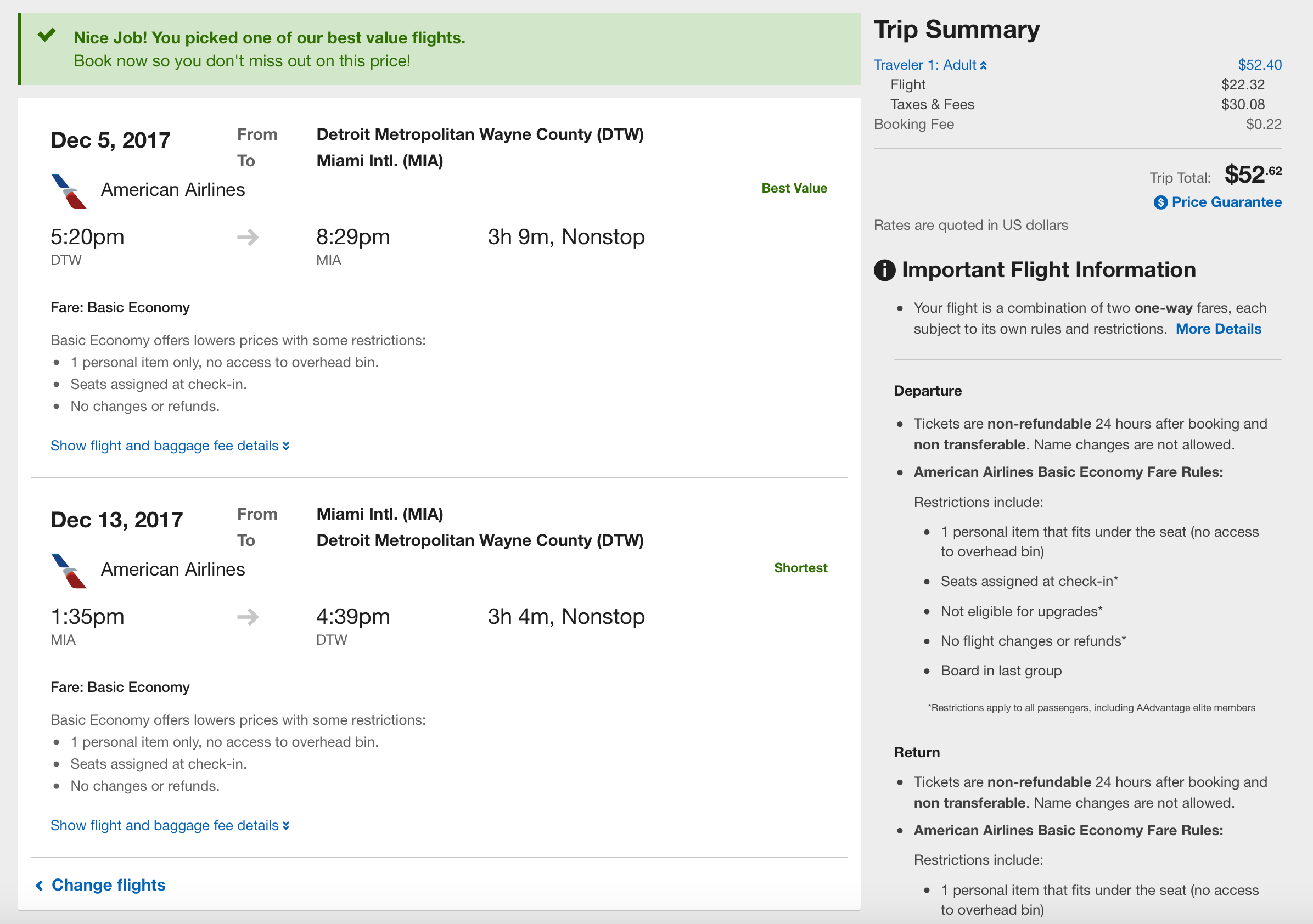 Detroit (DTW) to Miami (MIA) on American for $53 round-trip via Orbitz: