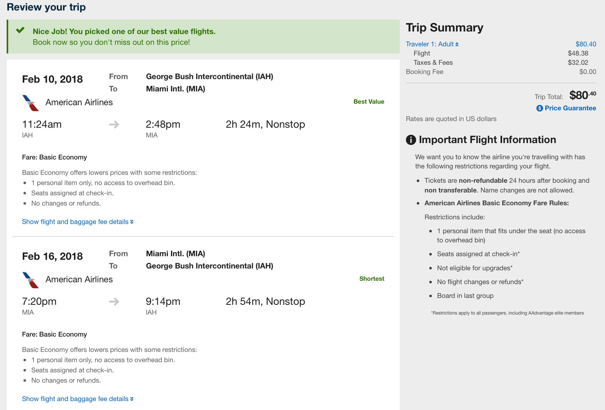 Houston (IAH) to Miami (MIA) on American for $80 round-trip via Orbitz: