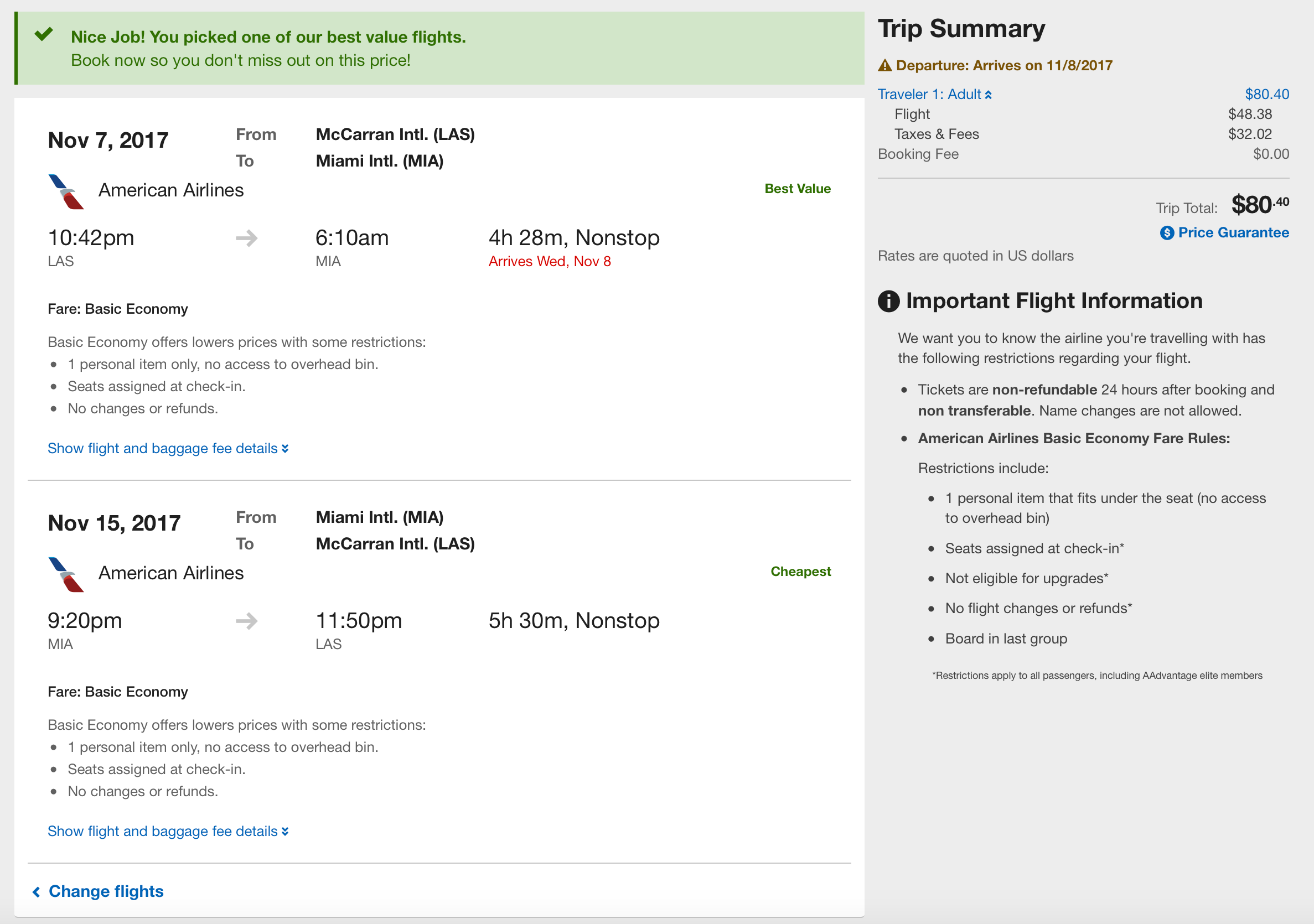 Las Vegas (LAS) to Miami (MIA) for $80 round-trip on American via Orbitz: